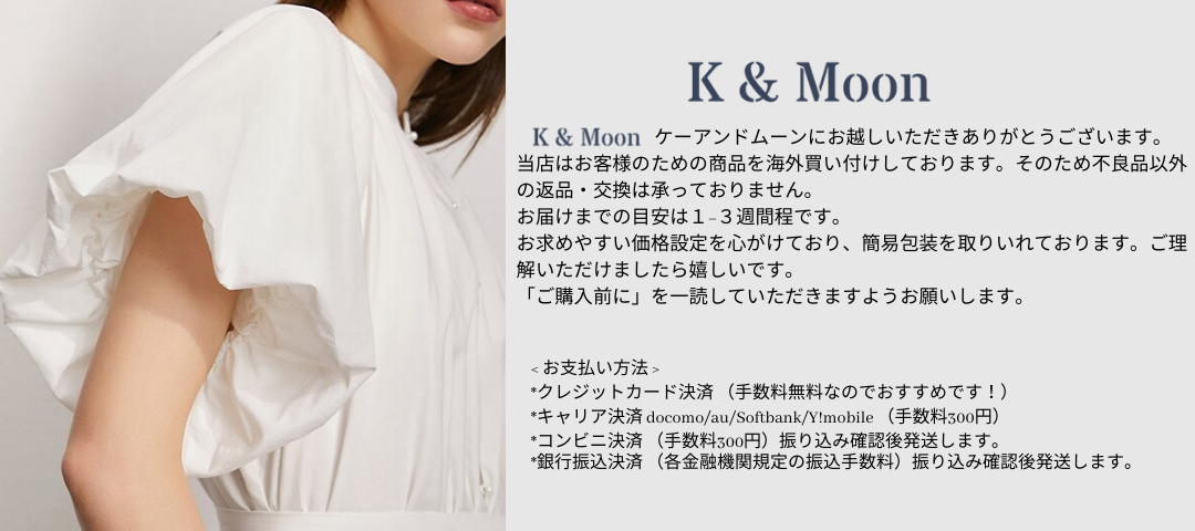 K & Moonは、大人かわいい女性のためのインポートセレクトショップです。おしゃれ大好きなあなたへ。あなたの幸せなシーンに選んでいただいてとてもうれしいです。K & Moon は全ての女性が月のように永遠に輝き続けるという願いが込められています。